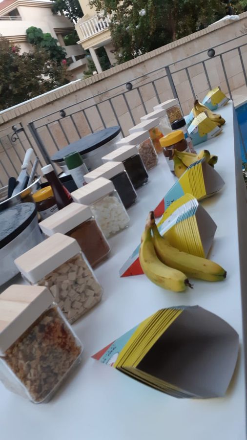 עמדת פנקייקים עם פירות בננות, אננס, ותותים (כשיש בעונה),